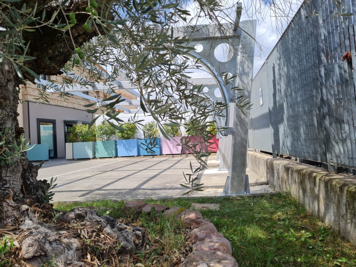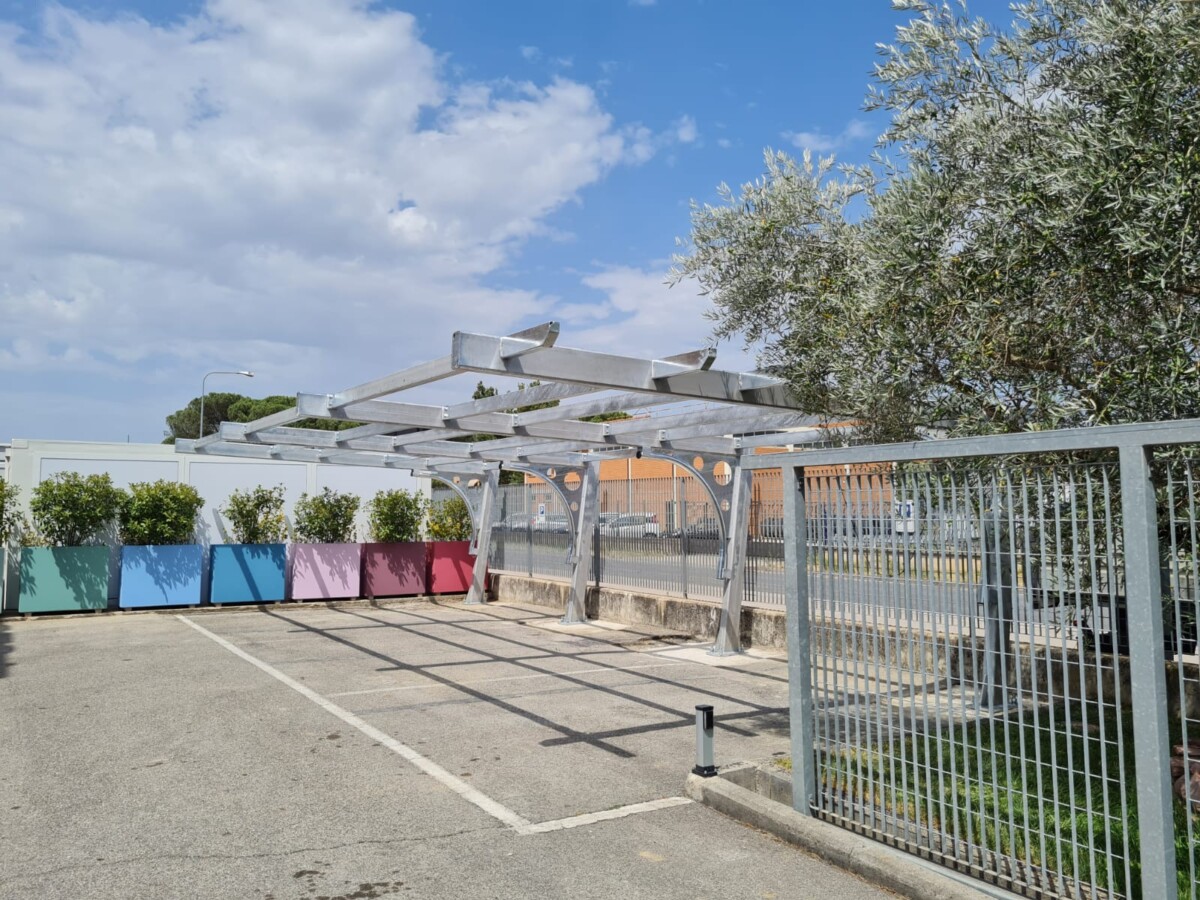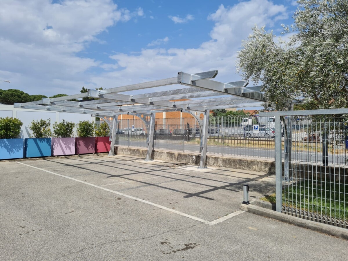 La pensilina è pronta per il montaggio dei pannelli fotovoltaici.