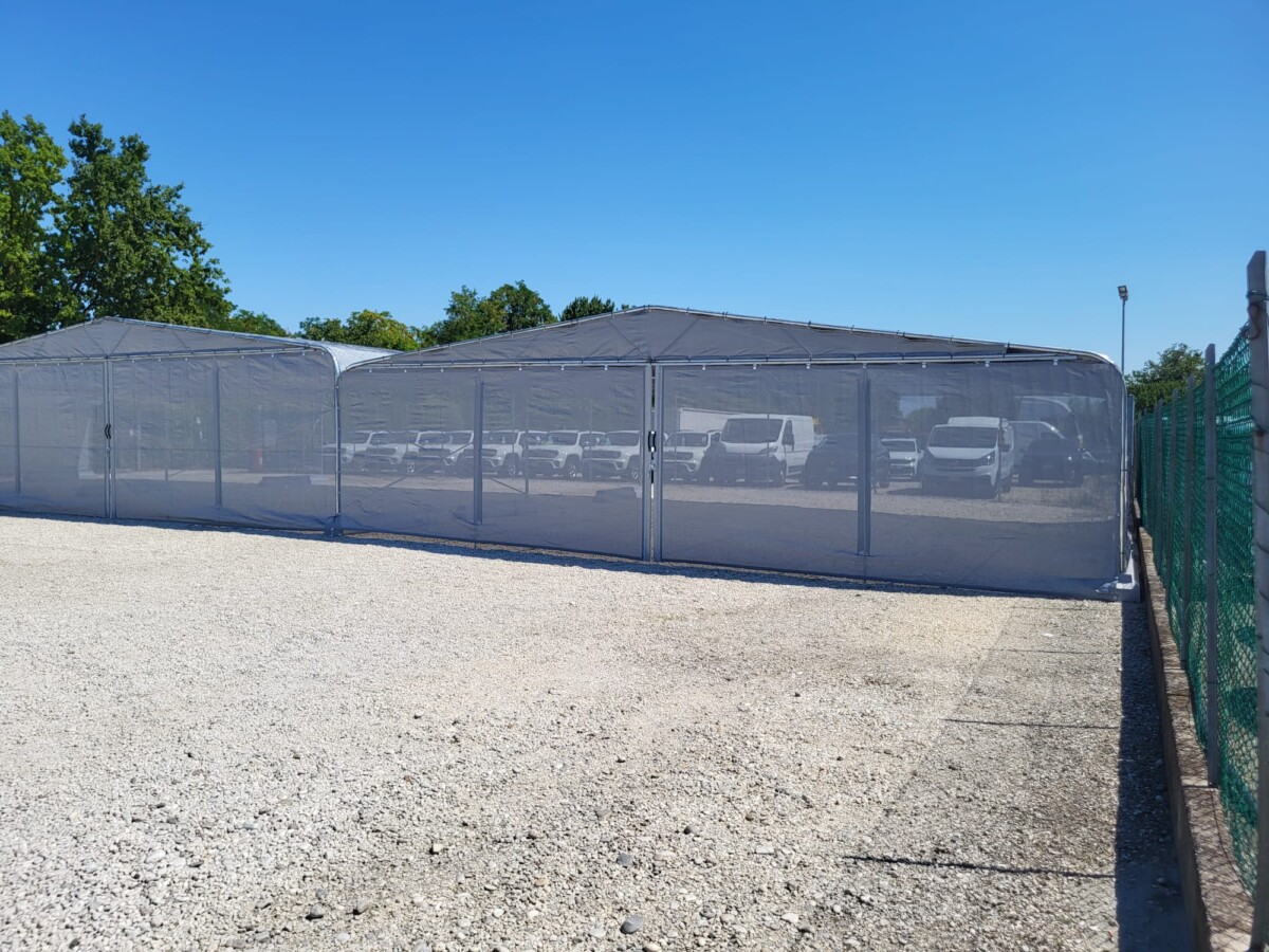 Il fissaggio è stato fatto con i nostri basamenti lunghi in cemento armato , il telo è ombreggiante antigrandine alta tenacità completo di sistema di fissaggio.
