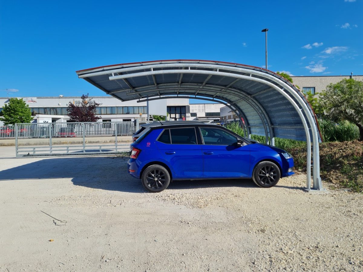 Struttura pensilina carico neve composta da palo curvo su piastra 400×300 sp. 20 mm. con tubolare di rinforzo diam.76 sp.3mm., e nr. 7 tubi cilindrici di collegamento fra una campata e l’altra .